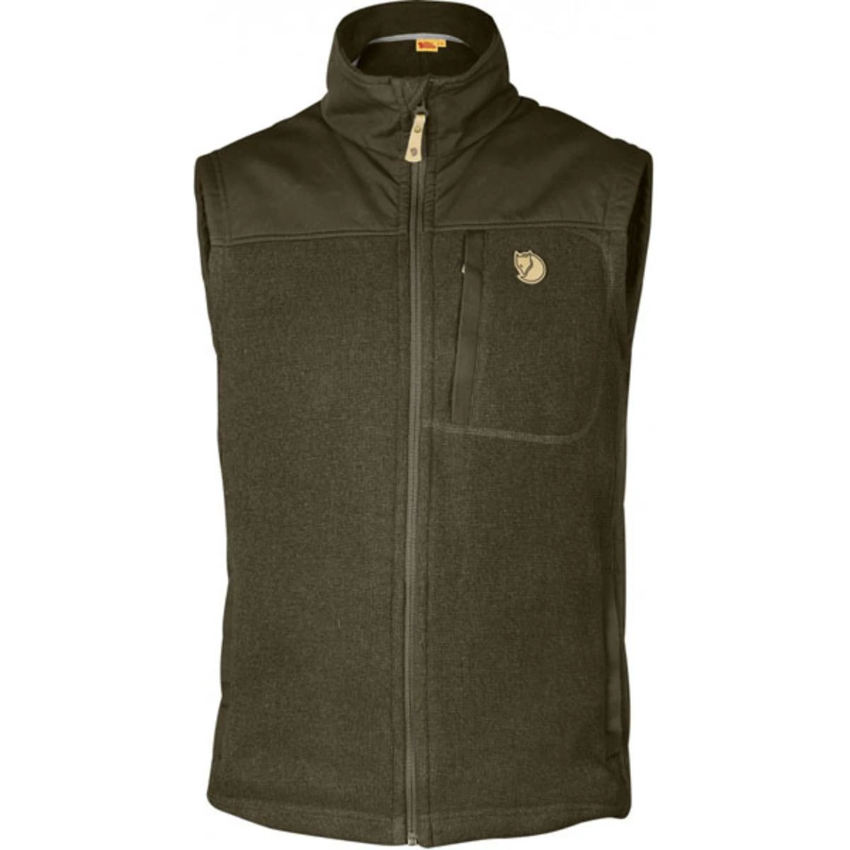 Warm, thick fleece vest that is knitted on the outside and softly brushed on the inside. G-1000 Original reinforcement across the shoulders for extra durability, which is practical when carrying a backpack. Perfect as a warm middle layer when skiing and can also be worn when you are relaxing in the cabin. Two side pockets and one breast pocket. Zipper in the front with protective flap at the chin. Regular fit.