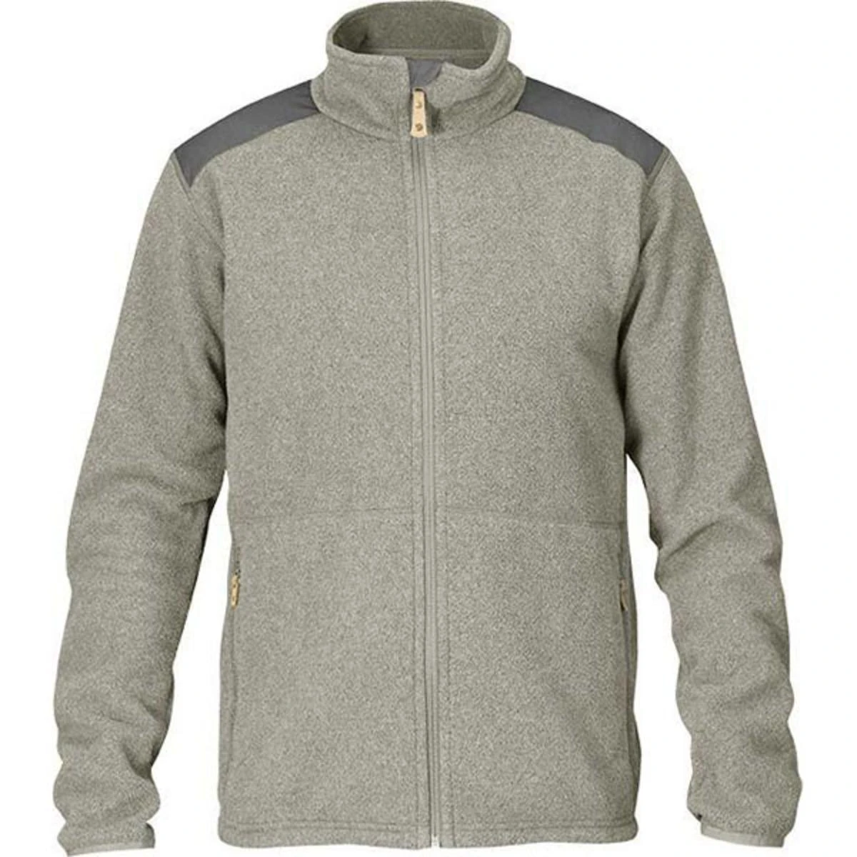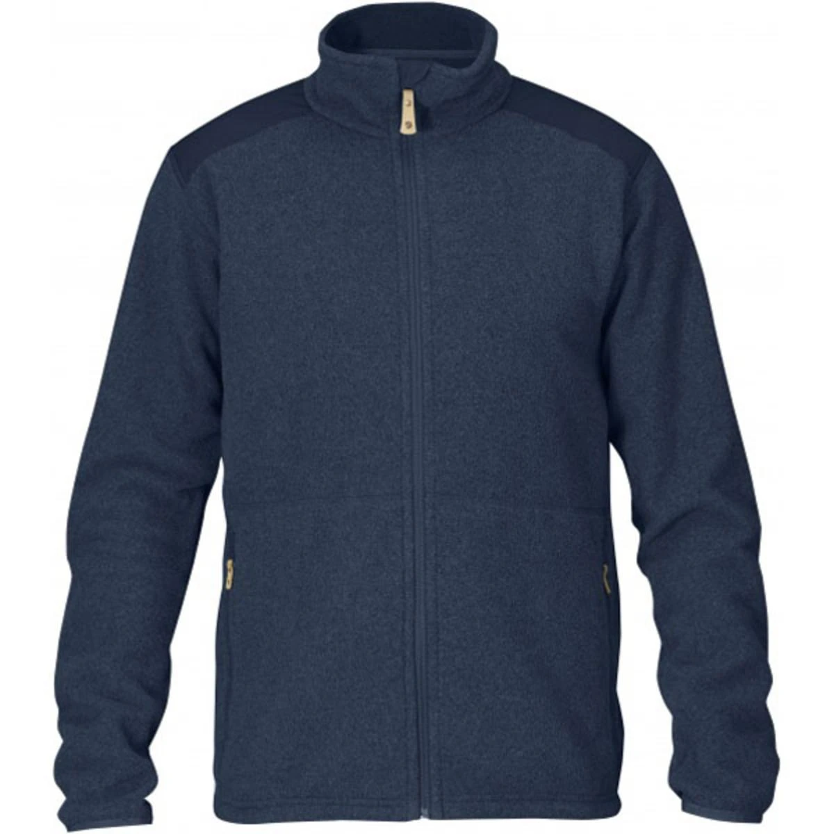 Lightweight and soft fleece sweater made from recycled polyester with a slightly marbled look. Just as comfortable under a shell jacket when gazing out from the Skierfe cliff on a crisp day as it is attractive on its own as dusk falls over your summer cabin. The fleece is manufactured in an environmentally friendly process that both spins and dyes the thread in the same step. For this model, that means about 50 percent less water and 31 percent less energy consumption compared to a traditionally produced fleece sweater. Reinforcement in durable G-1000 over the shoulders results in less friction under your backpack’s shoulder straps. High collar protects you from biting winds, and there is a protective flap of fleece between the zipper and chin. Two spacious zippered side pockets. All of the zipper flaps are made from natural tone leather.