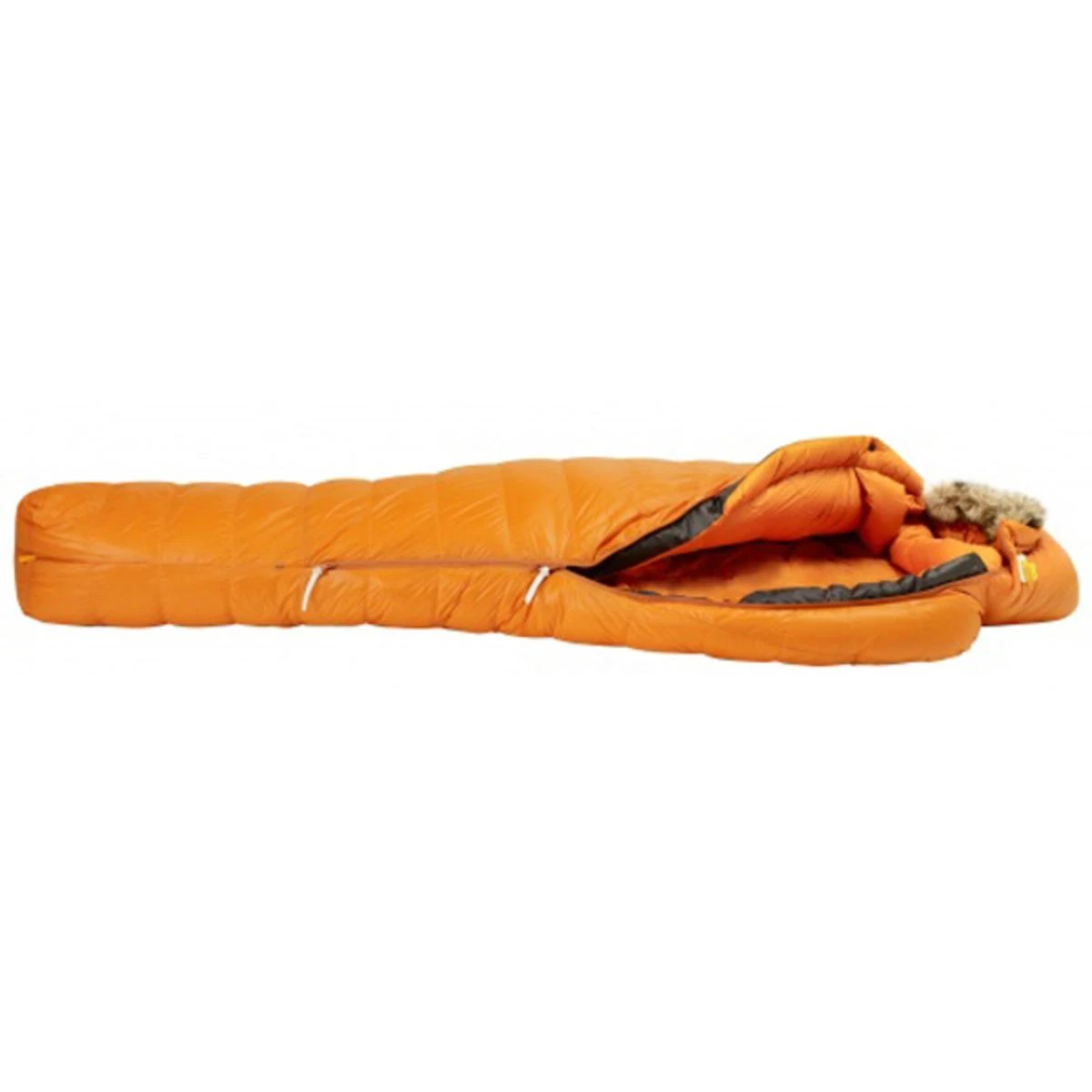 Well-insulated down sleeping bag with well thought-through-functions for winter trips in extreme cold. Padded with our highest-quality down, with excellent insulation and compressibility. The down is in box channels, reducing the risk of cold spots. The characteristic hood is inspired by our warmest jackets and has detachable synthetic fur edging that minimizes heat loss. The hoodx92s design allows it to follow the movements of the head which reduces the risk of moist air being breathed out into the bag. The hoodx92s design also means there is less air volume that needs to be warmed up, which leads to better insulation. A full-length, two-way zipper on the left side makes ventilating the bag easy. There is a shorter zipper on the right side and this combination makes it possible to sit in the sleeping bag with the arms out so it is possible to organize gear etc. The zipper has a down-filled protective flap that keeps draughts out and can be closed with press buttons in case the zipper should break, providing extra safety on long trips in cold conditions. Details in leather. Waterproof compression bag with roll-top closure. A large storage bag is also included and the sleeping bag has eyelets at the feet so it can be stored hanging. Comfort temperature (men) of -30xB0C (women -20xB0C). Fits individuals up to 195 centimetres tall.