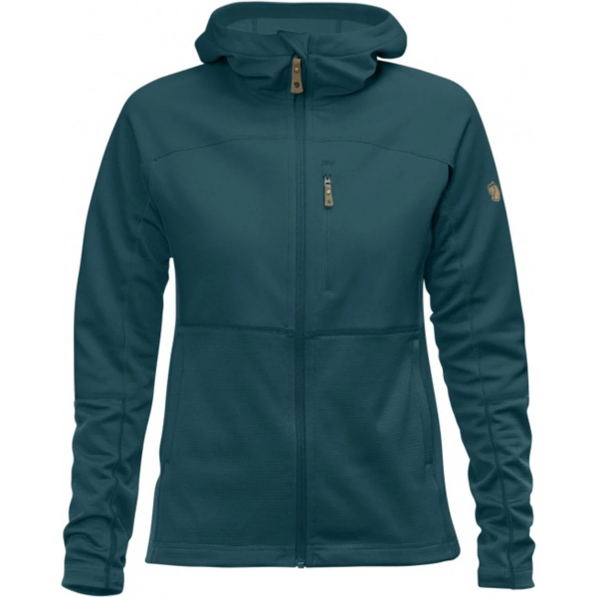 Light, convenient hooded sweater that combines two different fleece fabrics to warm where it is needed most and keep weight and packing volume down. The hood, shoulders and chest are made from flat-knitted polyester fleece (partially recycled) with a soft brushed inside, while the sides, lower torso and lower sleeves are in a lighter grid-structured fleece with superior ventilation. Perfect as a fast-drying and moisture-wicking mid layer on day trips or chilly summer evenings. Feminine, well-fitting cut and cosy hood with an opening for a pony tail. One-way zipper in front opening. One chest pocket and two hand pockets, all with zippers.