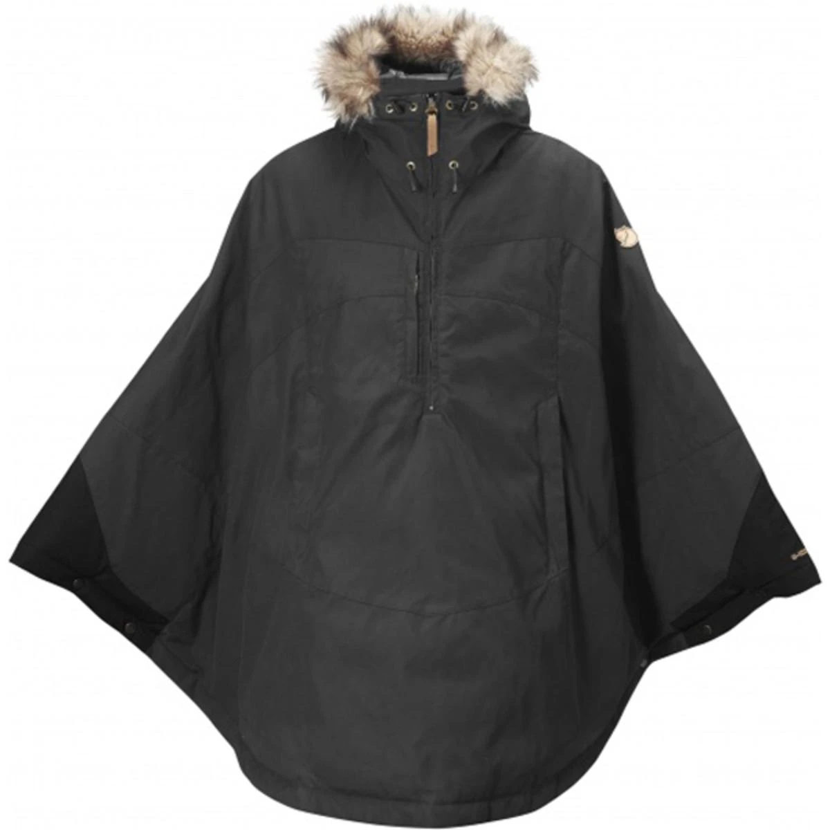 Smart knee-length cape inspired by the Sami’s versatile and practical Luhkka. Can be worn on its own during the fall and spring and as a reinforcement garment over normal winter clothing on cold winter days – just as the Sami have always worn it. When worn over normal shell garments it offers flexible protection against the cold and bitter winds, and any snow can be quickly shaken off before going indoors. A thin synthetic lining has been added to the strong, wind and water resistant G-1000 for extra warmth. The cape has a fixed, adjustable hood with detachable synthetic fur edging and a reflective band in the back. There is a half zipper in the front and a G-1000 gusset in the opening with soft fleece on the inside. A breast pocket is positioned immediately beside the opening and further down there is a kangaroo pouch. Push buttons at the wrists hold the cape in place when you are on the move. Zipper pulls and the trim are in natural tone leather.