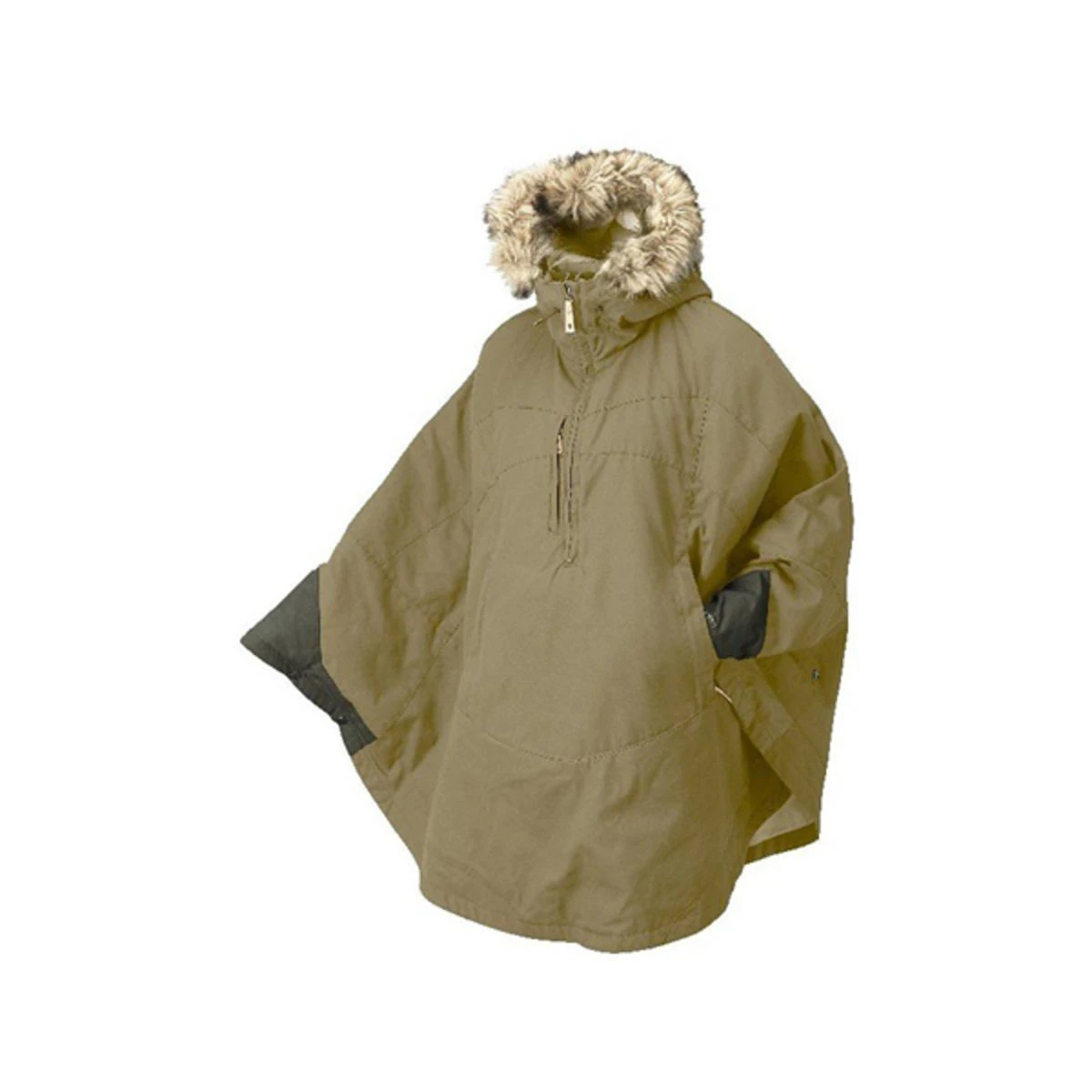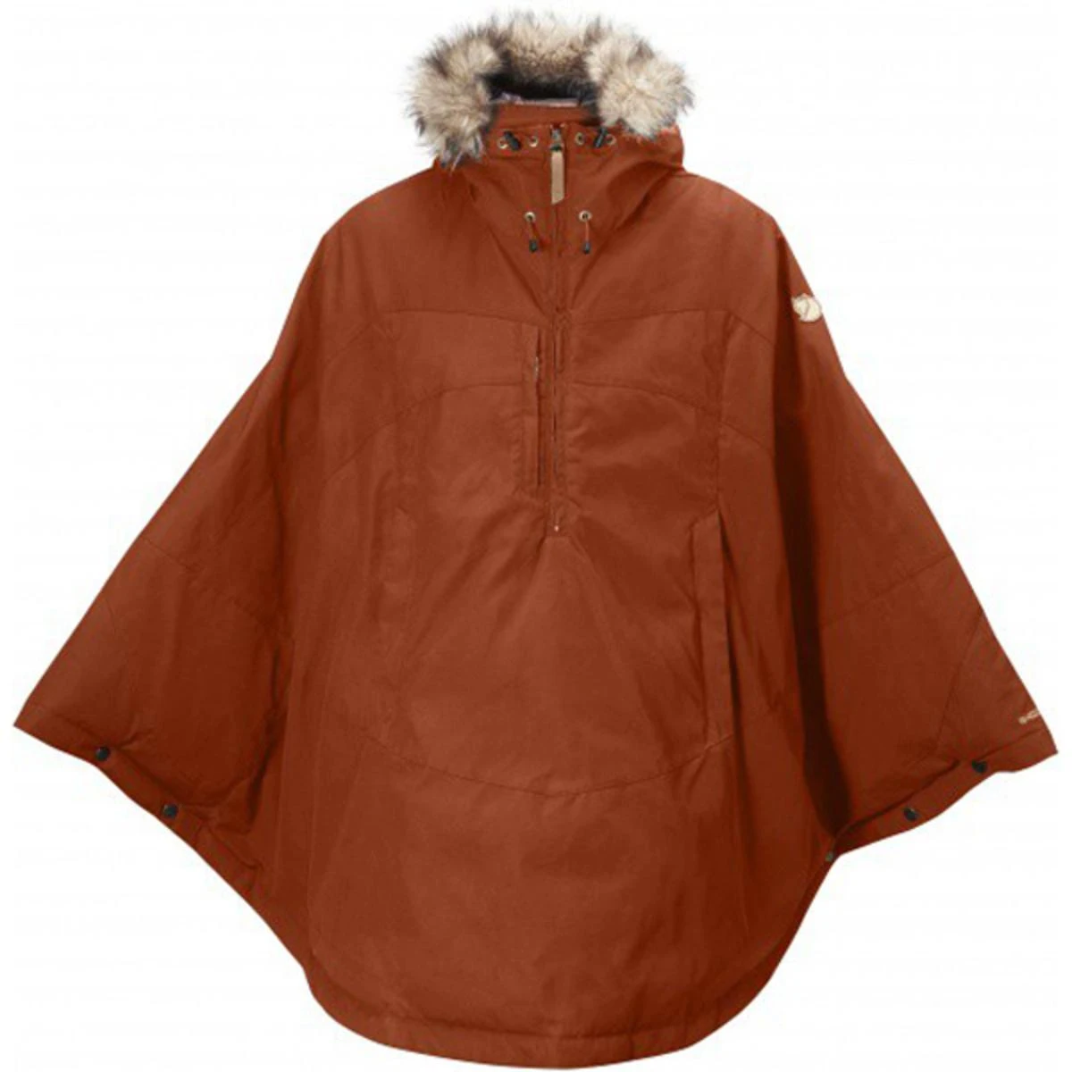 - The cape has a fixed, adjustable hood with detachable synthetic fur edging and a reflective band in the back